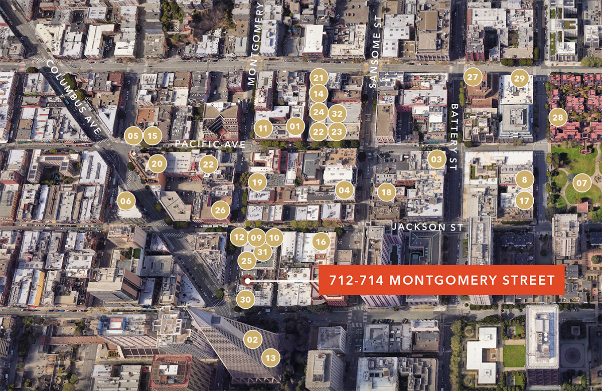 Located in San Francisco’s charming and vibrant Jackson Square neighborhood, the Property dates back to the mid-1800s and has been thoughtfully and sensitively adapted to provide modern, fully permitted commercial space. Delivered partially vacant at the close of escrow or shortly thereafter, 712–714 Montgomery Street represents a special opportunity for investment, repositioning, or owner-user occupancy in a highly desirable retail and office location, as evidenced by the strong Jackson Square submarket fundamentals along with the abundance of high end retailers, world-class restaurants, premier venture capital/private equity firms, and AI/Tech companies in the immediate area.